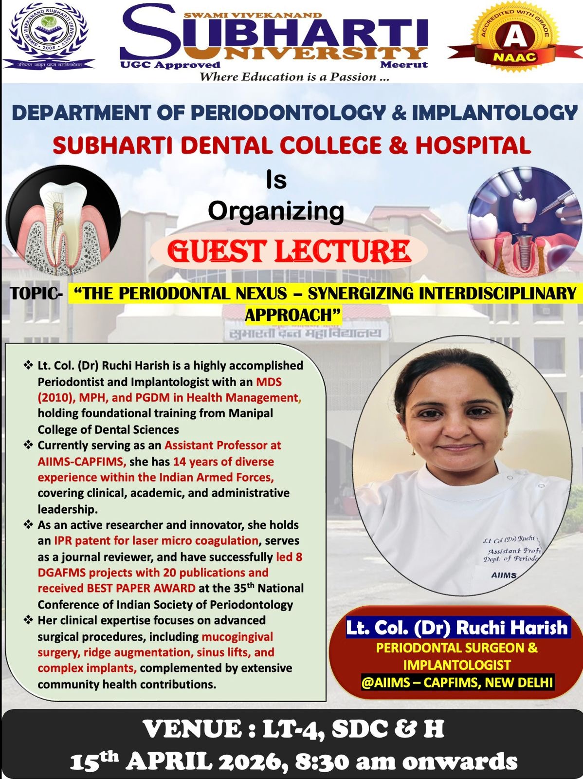 Welcome to Subharti Dental College, Meerut, a centre of education, research & highest level of clinical care. Here we cultivate in our students the values of shiksha (education) sewa (service) & sanskar (human values) Affiliated to Swami Vivekanand Subharti University, this college offers a variety of courses; Bachelor of Dental Surgery (BDS), Master of Dental Surgery (MDS), Diploma in Dental Machanic (DDM) & PhD in Dental Sciences.