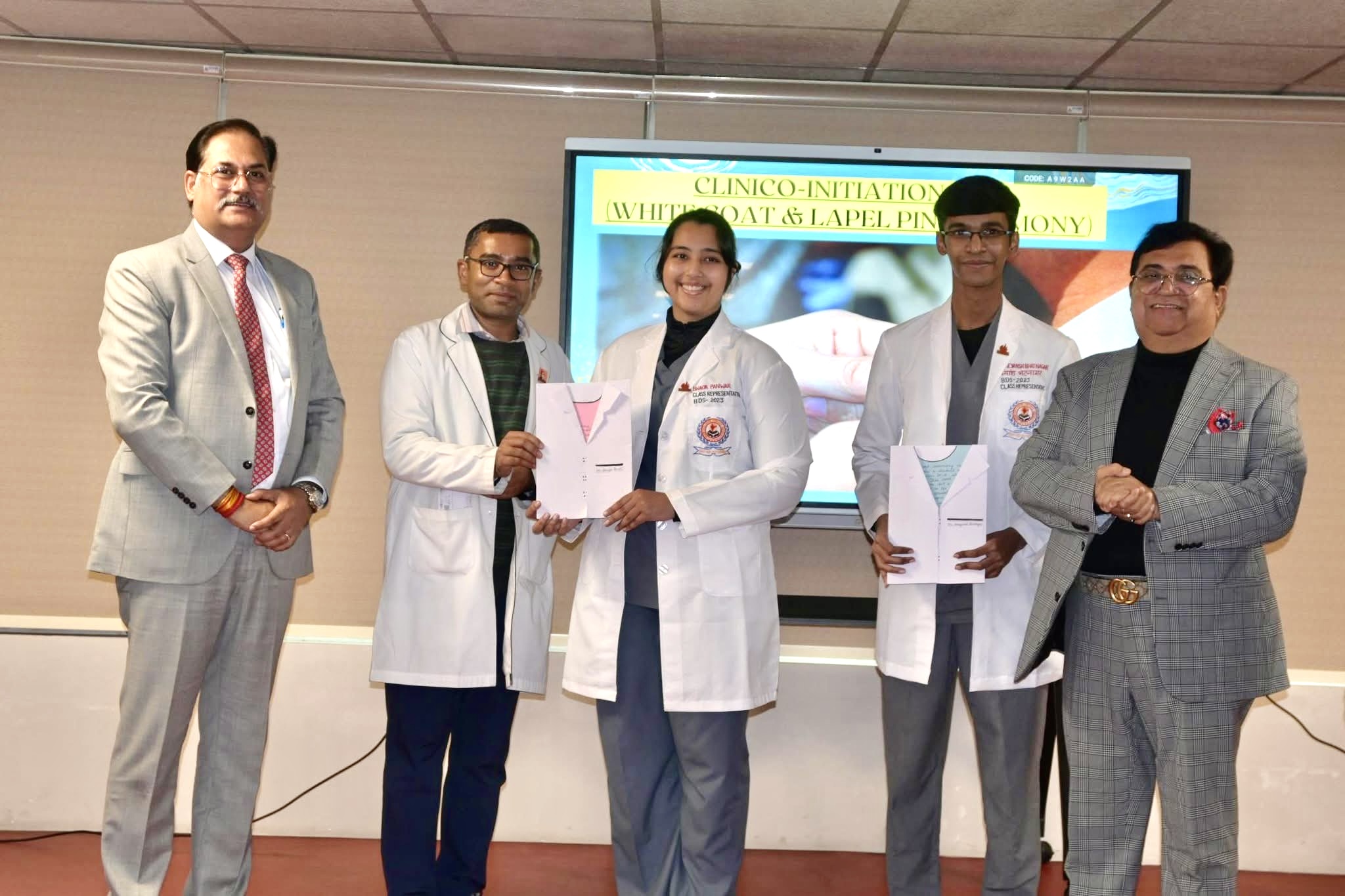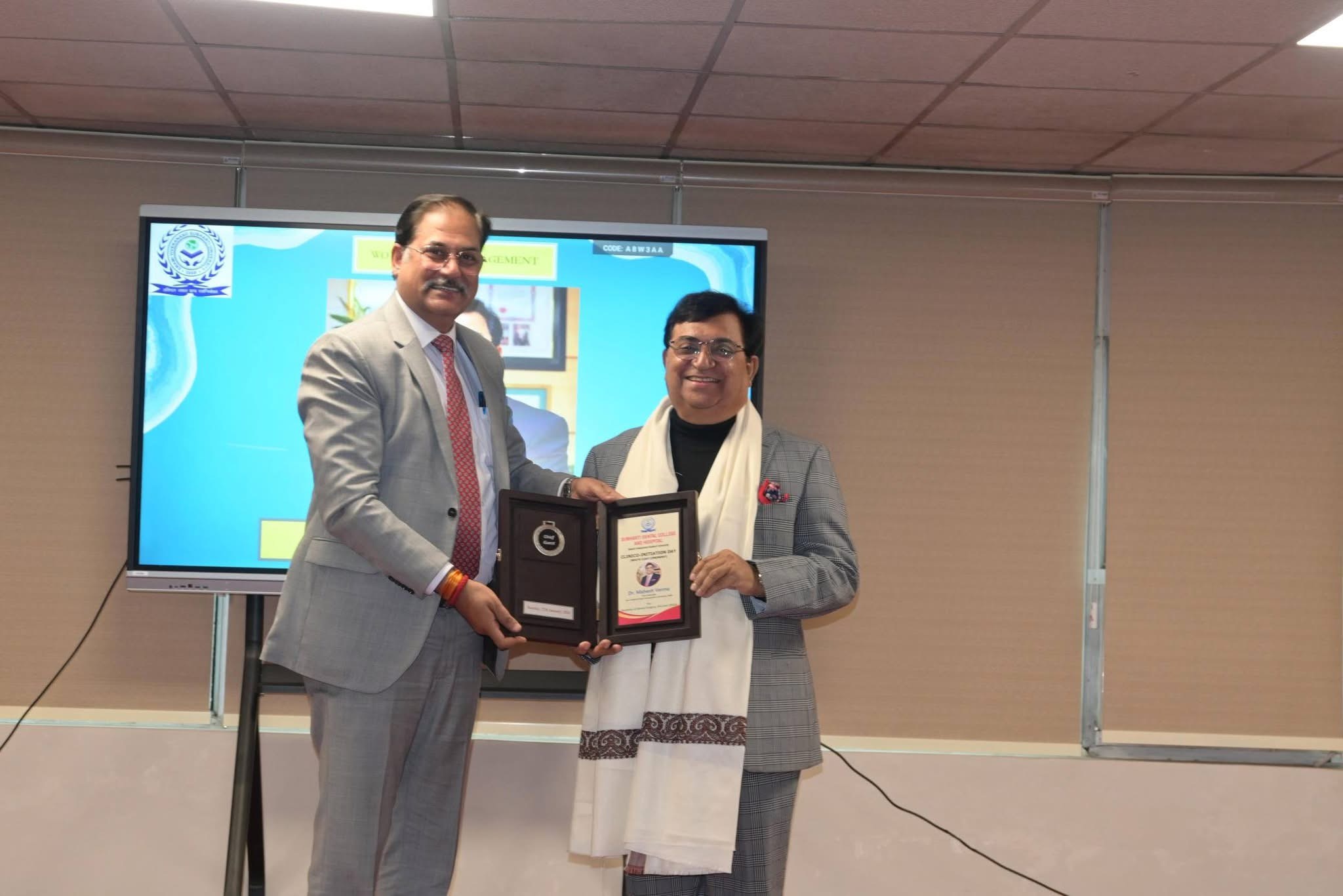 ACTIVITIES: Clinico-initiation day (White Coat Ceremony) for BDS 2023 Batch was organized in Subharti Dental College and Hospital on 27th Jan, 2026. It is an important day after which the student embarks on the journey to become not just a clinician but also a compassionate doctor. This important ceremony was conducted under the guidance of our Principal & Dean, Dr. Nikhil Srivastava. The Program was graced by the presence of Dr Mahesh Verma, Padma Shri and B. C. Roy awardee, Vice Chancellor Guru Gobind Singh Indraprastha University, Delhi. He blessed and motivated the students with his encouraging words. During the ceremony, the White coat and Lapel Pins were conferred on the students. Dr Krishnamurty, Executive Officer SVSU made the students take an Oath to treat all the patients with sincerity, dedication & compassion. Dr Nikhil Srivastava, Principal SDC bestowed academic awards for securing honors in various BDS Professional examinations to Students. Parents of the student awardees were also honored along with their wards. The ceremony was also graced by the presence of Dr Mahesh Kumar Mittal, Principal SMC.