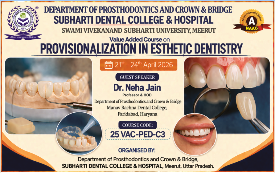 Department of Prosthodontics and Crown & Bridge is organizing “Value Added Course”on the topic “Provisionalization in Esthetic Dentistry” for Undergraduates (BDS IInd Year & IIIrd Year) from 21st to 24th April 2026 at Subharti Dental College & Hospital, Meerut by Dr. Neha Jain, Professor & Head, Department of Prosthodontics and Crown & Bridge, Manav Rachna Dental College, Faridabad, Haryana.